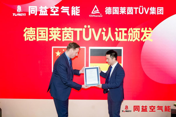 德國萊茵 TÜV 集團,作為擁有 150 多年深厚底蘊的全球認證巨頭,業務覆蓋56個國家,設有 500 多個辦事處及 236 個實驗室,以嚴謹、高質量服務聞名于世,提供安全、質量、環保一站式解決方案。發布會上,集團 General Manager Matthias Grzam 致辭闡述萊茵 TÜV認證的價值,隨后與唐旭初總經理共同頒發認證證書,此次合作不僅彰顯同益空氣能對品質的嚴苛追求,更凸顯其借認證之力突破國際市場壁壘、共建低碳未來的堅定決心。